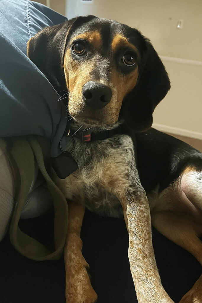 Bowie: 9 month old Beagle / Blue Tick Hound mix. Good with cats and kids, and new to dogs. She is available for foster care or adoption!